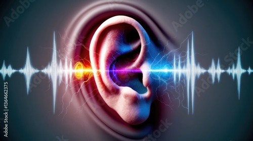 A surreal human ear with vibrant sound waves and energy patterns, symbolizing hearing and audio technology.