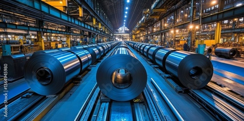 A steel sheet roll, made in a hot rolled strip steel mill and stored in a factory warehouse, represents the steel industry, factory production, warehouse storage, hot rolling process, and metal