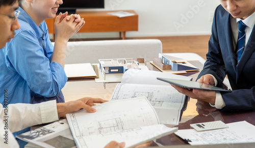 Residential sales: Owner and salesman discussing while looking at design drawings, hands, no faces