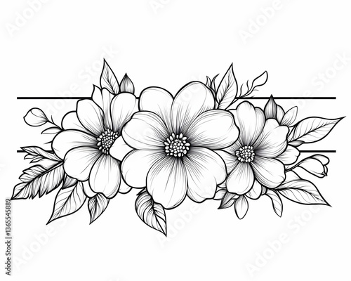 Elegant black and white floral arrangement with three large blooms and accompanying foliage, separated by a horizontal line