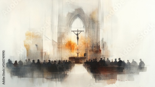 Artistic interpretation of a communion service, with figures assembled at the altar in a serene, faith-filled atmosphere.