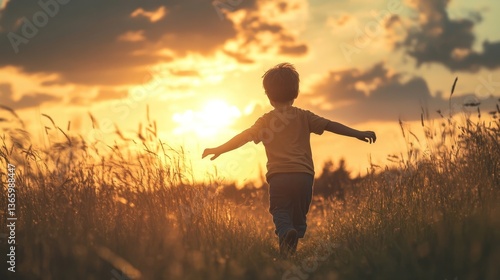 A young boy joyfully approaches jesus in a sunset field, embracing faith and innocence