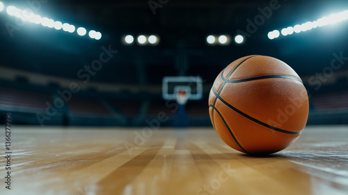 A basketball on a polished court under dramatic blue arena lights, symbolizing anticipation before a major game or event.