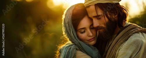 Couple dressed in biblical attire share a loving embrace in a sunlit field