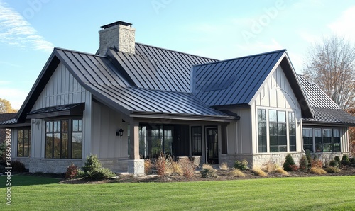 Standing seam metal roof with gable end on a warm sunny sky, warm sky, industrial style