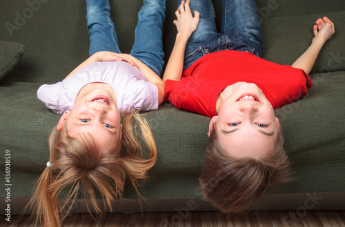 Brother and sister wearing casual clothes laying upside down on a green couch at home smiling