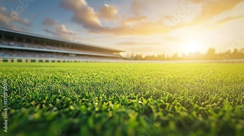 In the golden light of afternoon, a close-up shot captures the immaculately maintained horse racing track, complete with vibrant white rails and lush green turf, and the grandstand looming in the