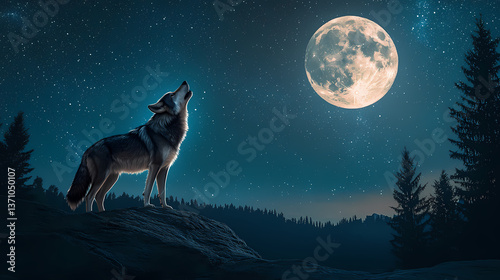 A majestic wolf howls at a luminous full moon in a starlit sky, embodying the essence of wilderness and the beauty of nature at night. Starlit Echo. Illustration