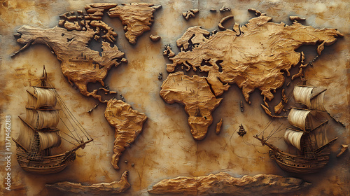 World Map with Vessels: An aged map of the world, showcasing detailed landmasses and accompanied by depictions of sailing vessels, evoking a sense of exploration and history.