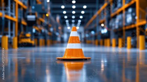 A bright orange traffic cone in a warehouse, marking a safe zone amidst equipment and busy operations, with a focus on workplace safety.