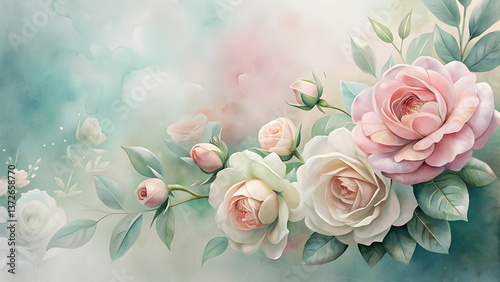 *"Watercolor Roses Background – Soft Pink & White Blooms with Green Foliage, Symbolizing Love for Prophet Muhammad (PBUH)"*