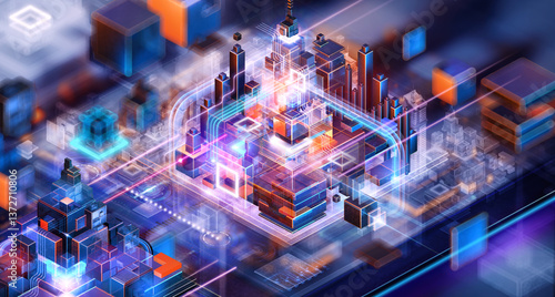 Smart city technology, 3D futuristic hub model. Urban innovation, planning, digital infrastructure, intelligent connectivity. Metropolis data-driven architecture, AI-powered buildings, network system
