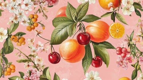 53.A lively seamless design with detailed vector illustrations of fruits like peaches, cherries, and oranges, interspersed with dainty flowers and foliage for a fresh, summery feel on pink.