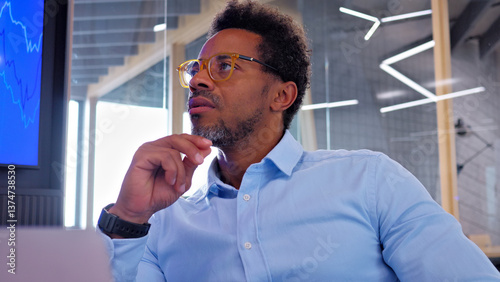 A man in a blue shirt and glasses sits in a modern office, staring at a computer screen, symbolizing focus and productivity.