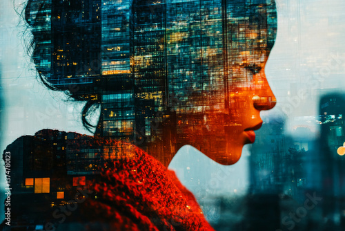 Double exposure image woman profile superimposed over cityscape at night, red tones, textured, conveying urban life, contemporary feeling, modern aesthetics