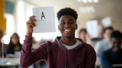 Student celebrates academic achievement with proud smile while holding an A grade paper in classroom setting