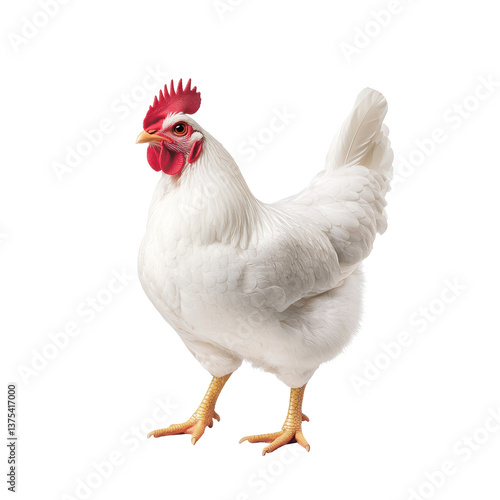 A white chicken with a prominent red comb stands confidently, showcasing its plump body and vibrant feathers.
