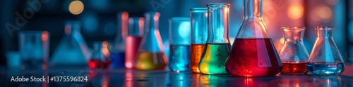 Close up of test tubes and beakers with various solutions on periodic table backdrop, data analysis, science experiment, scientific research
