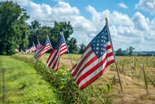 American flags wave in the summer breeze along a rural road, a patriotic display of national pride, Patriotic flags waving in the summer breeze