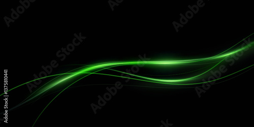 Green speed lines, light in motion, glowing light trails with sparkles. Vector decor wind.