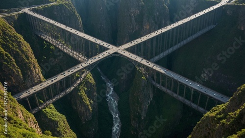 Two massive bridges intersect high above a gorge, connecting roads and spanning a lush landscape with a flowing river.