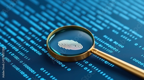 A magnifying glass reveals a fingerprint over a digital background filled with binary code, symbolizing forensic analysis and digital security.
