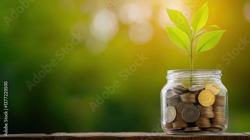 A sprouting plant emerging from a jar filled with coins symbolizing the potential for financial growth investment and sustainable development