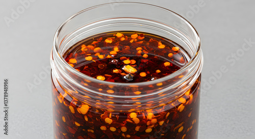 Delicious and fiery homemade chili oil crisp in a glass jar, against gray background