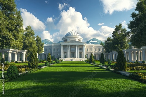 Imagine a neoclassical palace with a central dome and porticos on each side .