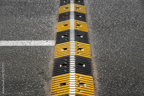 Próg zwalniający na drodze z pasami ostrzegawczymi. Charakterystyczne czarno-żółte oznaczenia na asfalcie