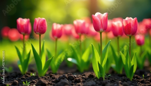 Pink tulip stems rise from the ground in a sunlit garden, pink tulips, plant life, greenery