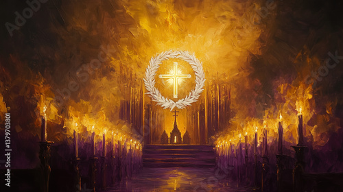 Corpus Christi, banner gradation of dark purple to bright gold, IHS emblem shining in the center surrounded by white wreath, background of classic church interior with burning candles