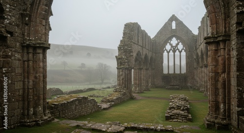 Ancient Abbey Ruins in Mist - Misty morning view of aged abbey ruins, showcasing gothic architecture and overgrown grounds. Serene and atmospheric