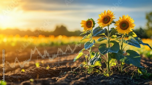 Sunflowers in a vibrant field at sunset with growth analytics superimposed on the soil
