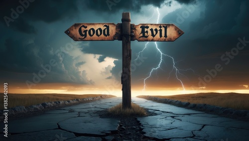 Signpost depicting good vs evil