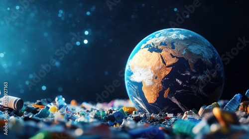Earth is depicted surrounded by plastic waste, highlighting environmental issues and pollution. image evokes sense of urgency regarding planet health and sustainability