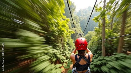 Back view of excited young female while having fun on high ropes with belay cables protective helmet in forest adventure park in daylight. Zip line. AI