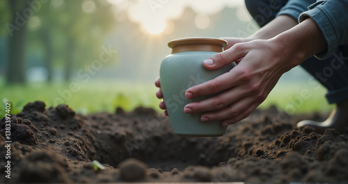 The urn for ashes in the hands is buried in the ground, symbolizing loss and funeral rites for loved ones