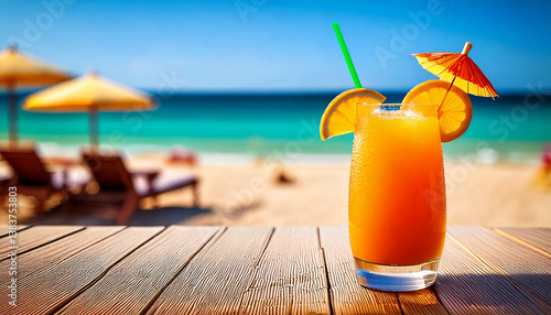 Un delicioso cocktail tropical frio con zumo de naranja adornado con sombrilla y pajita en la mesa de un bar junto al mar en vacaciones de verano