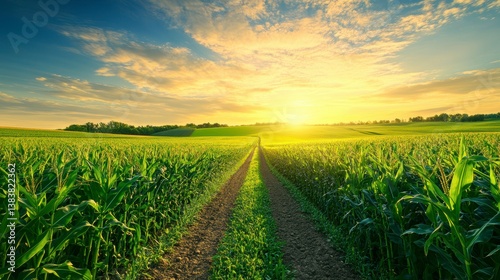 Sun setting over a vast, green cornfield with a dirt road leading towards it.