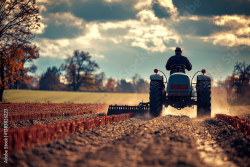 An old tractor plowing field, preparing the land, highlighting the hard work and dedication involved in farming and agriculture under a cloudy sky, rural landscape.