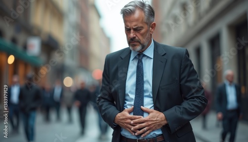 Middle-aged businessman clutching stomach, grimacing in pain. Unwell pro stands on busy city street, feeling discomfort. Digestive issues, stomach ache. Health problem. Abdominal pain.