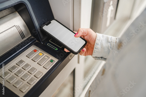Female hand with mobile phone withdrawing money from cash machine