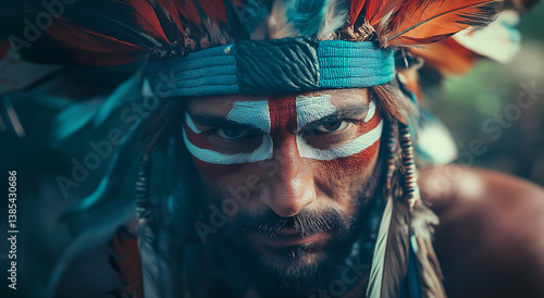 Retrato em close-up de um homem com um colorido cocar indígena e pintura facial.
