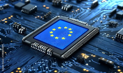 EU Digital Sovereignty: A Microchip Displaying the European Flag on a Circuit Board