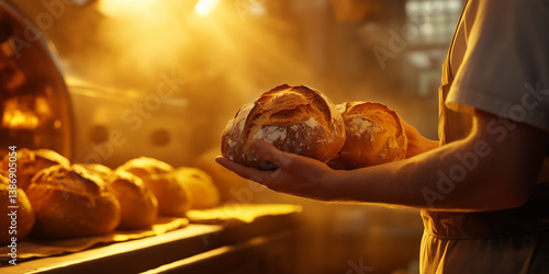 Bäcker stehen vor riesigen Öfen, halten frisch gebackenes, goldbraunes Brot in den Händen, die Luft erfüllt vom Duft von Weizen und Butter.