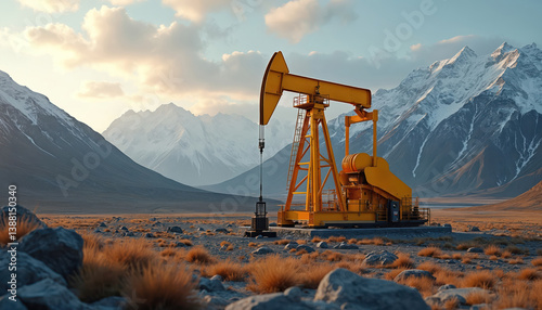 Oil extraction industry. Yellow oil pump jack works on arid terrain with snowy mountains background. Energy production, resources, fossil fuel mining. Petroleum industry, drilling rig, technology,