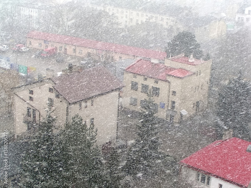 Obfite i gęste opady śniegu w mieście (Ostrowiec Świętokrzyski). Płatki śniegu przesłaniają widok, tworząc rozmyty efekt na beżowych i jasnych strukturach. Pośród opadów śniegu dachy domów.