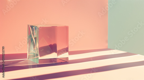A minimalist composition featuring a transparent glass cube placed on a soft pastel background with sharp, defined shadows. This visual metaphor symbolizes mental clarity, focused thought, and clean i