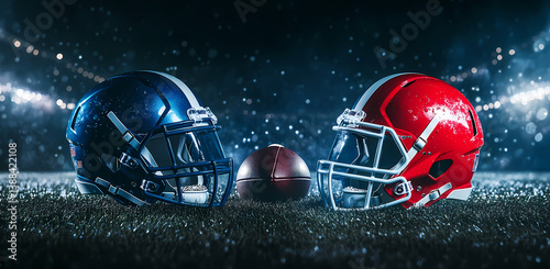 Gridiron Showdown: Two football helmets, one navy, one red, face off dramatically in a stadium under the dazzling spotlights, a symbol of rivalry and intense competition.